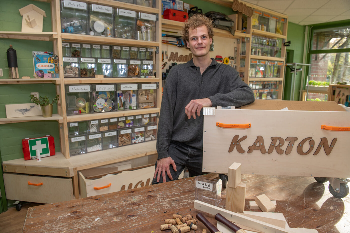 Het liefst wil Mike van de Geijn alle basisscholen in Leiden en de regio voorzien van zijn maakkasten. De eerste staat op de Daltonschool in Oegstgeest. Leerlingen vullen deze kast met restafval van school en huis. Zo komen zij er spelenderwijs achter dat het vaak waardevol materiaal is. En dat is precies wat deze jonge ondernemer wil bereiken.