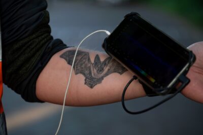 Caitlin en haar collega’s kijken ook naar de aanvliegroutes en de plekken waar ze eten zoeken. Ze werken met een batdetector en een warmtebeeldcamera. De batdetector vangt de verschillende geluiden van de vleermuizen op waarmee ze de soort bepalen en verblijfplaatsen opsporen. Met de warmtebeeldcamera bepalen ze de precieze verblijfplaats.